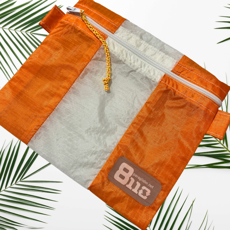 本来の使用用途の役目を終えたパラグライダーのキャノピー(生地)・ライン(紐)を再利用して作ったポーチです。