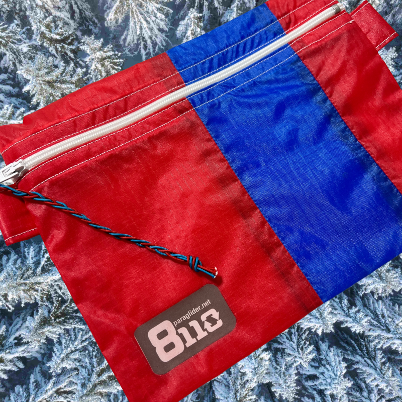 本来の使用用途の役目を終えたパラグライダーのキャノピー(生地)・ライン(紐)を再利用して作ったポーチです。